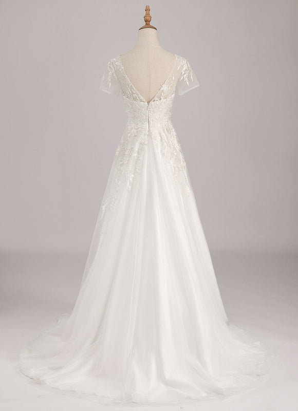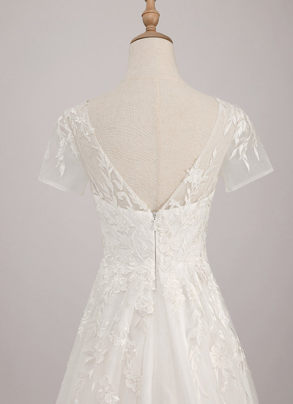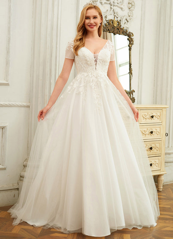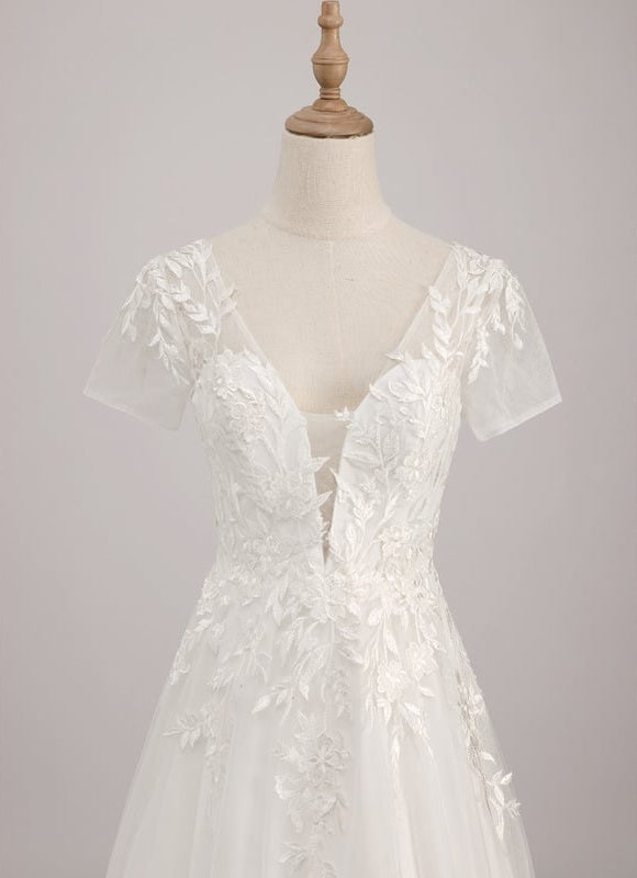 Chaque détail de cette robe a été pensé pour vous sublimer. Le tissu en dentelle fine, orné de motifs floraux délicats, habille le bustier et les courtes manches, créant un effet romantique et sophistiqué. Le col en V flatteur et le dos en V élégant mettent en valeur votre port de tête et votre silhouette, tandis que la coupe princesse, sans fente sur la jambe, assure une allure royale et une liberté de mouvement. Pour votre confort et votre confiance, la robe est dotée d'une doublure complète, d'un soutien-gorge intégré et d'armatures de maintien, vous assurant un maintien parfait tout au long de la journée. Cette Robe De Mariee Dentelle Pas Cher est une véritable ode à la féminité et à la grâce, prête à vous accompagner vers votre "oui" pour la vie.